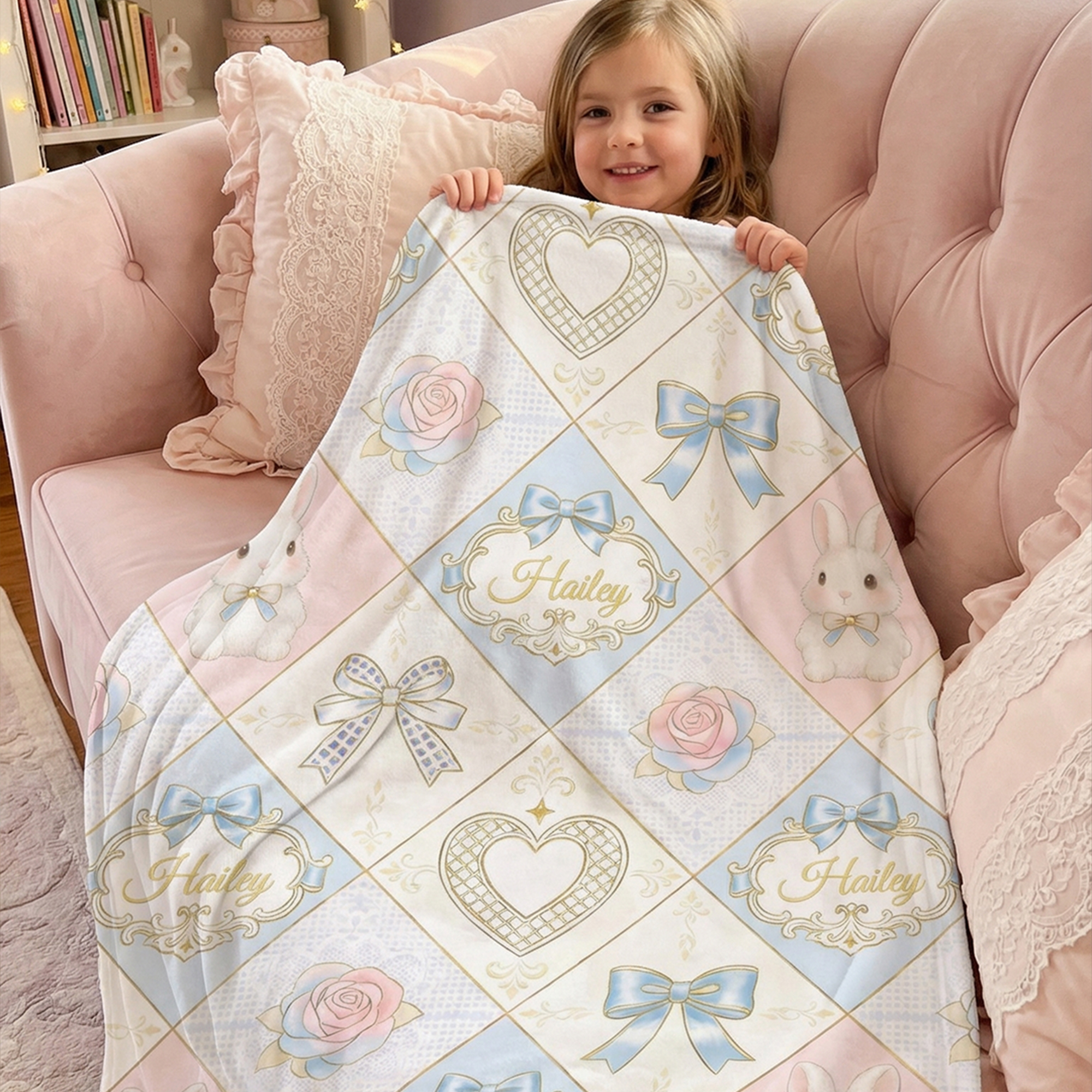 Personalized Rose Bow Heart Cute Rabbit Blanket with Name |
